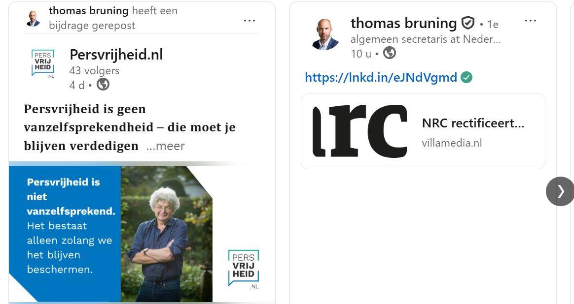 Geestig vond ik dat de baas van journalistenbond NVJ een post over persvrijheid met (ex-) NRC-journalist Joep Dohmen naast een post over de NRC-rectificatie plaatste. De NVJ staat altijd op de bres om de vrijheid van journalisten te benadrukken, maar beseft niet dat vrijheid en macht verantwoordelijkheid meebrengen voor zelfreiniging.